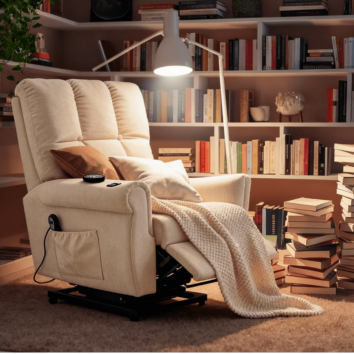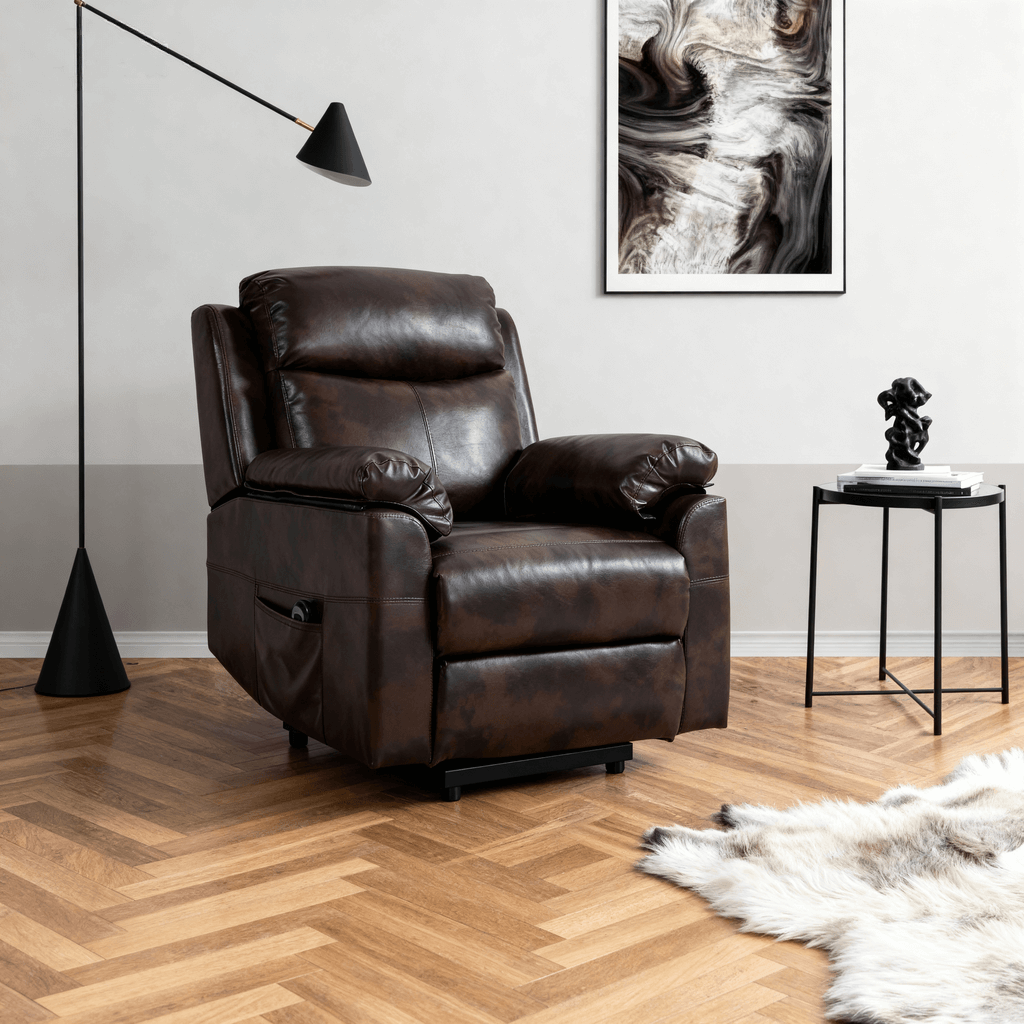 Power lift, side pockets, remote control, footrest for comfort.