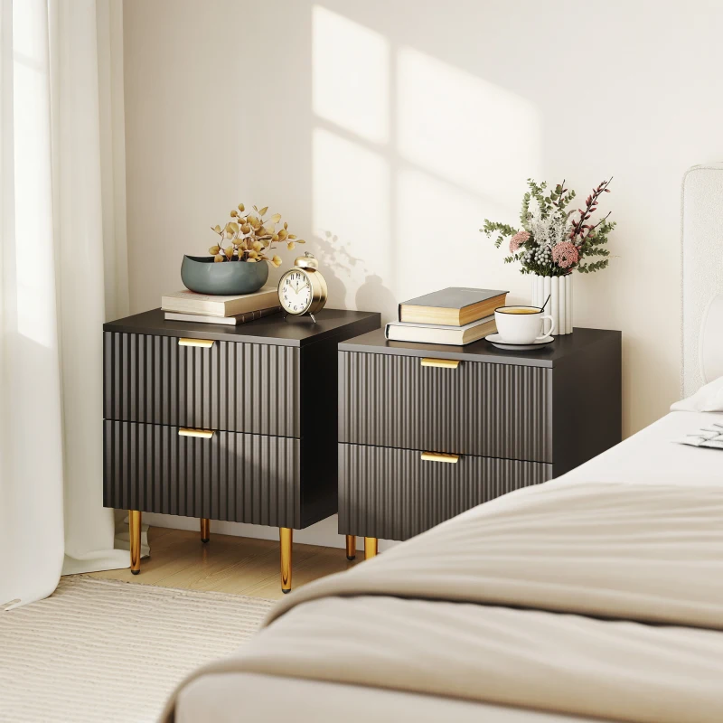 • Modern Elegance: This black nightstand features sleek gold finger pulls and fluted drawer panels, adding sophistication and facilitating easier cleaning beneath the unit