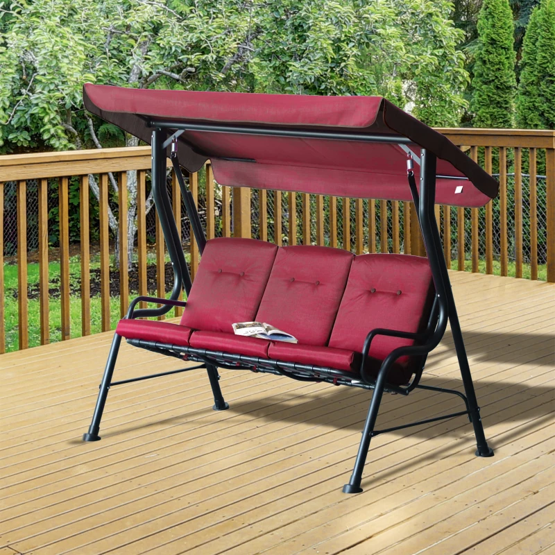 Outsunny 3-Person Porch Swing Chair, Patio Swing Bench with Adjustable Canopy, Removable Thicken Cushion and Weather Resistant Steel Frame for Outdoor, Garden, Poolside, Wine Red(m-7)